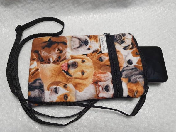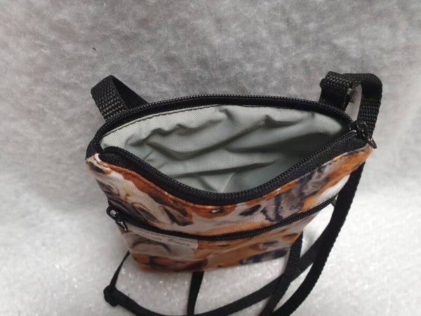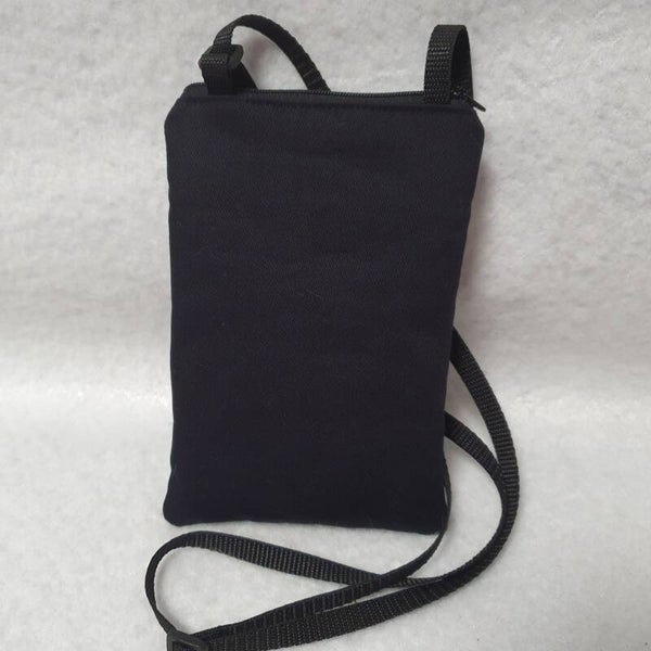 Näppärä kännykkälaukku kahdella vetoketjutaskulla ja säädettävällä hihnalla, max pituus 145cm. Ylätaskuun menee puhelin, jopa kaksi kevyillä suojakuorilla. Alataskuun avaimet ja pieni kukkaro. Päälinen puuvilla, vuori kevytnailon. Kork. 20 cm, lev. 13 cm.