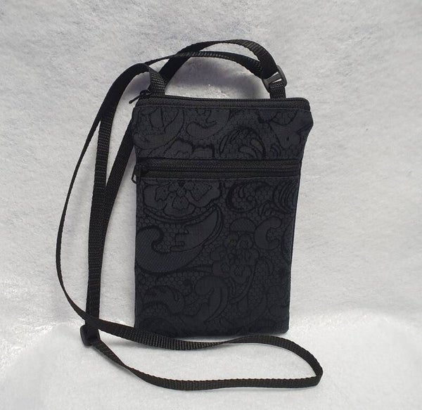 Näppärä kännykkälaukku kahdella vetoketjutaskulla ja säädettävällä hihnalla, max. pituus 145cm. Ylätaskuun menee puhelin, jopa kaksi kevyillä suojakuorilla. Alataskuun avaimet ja pieni kukkaro. Päälinen sekoitekangas ja puuvilla, vuori kevytnailon. Kork. 20cm, lev. 13cm.