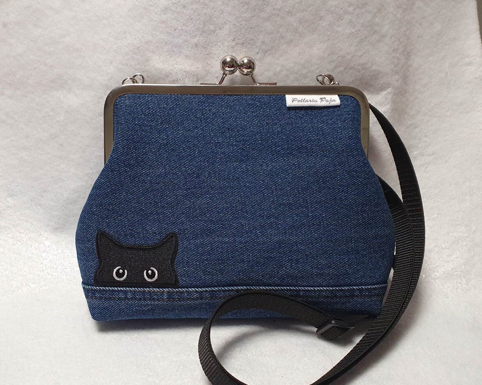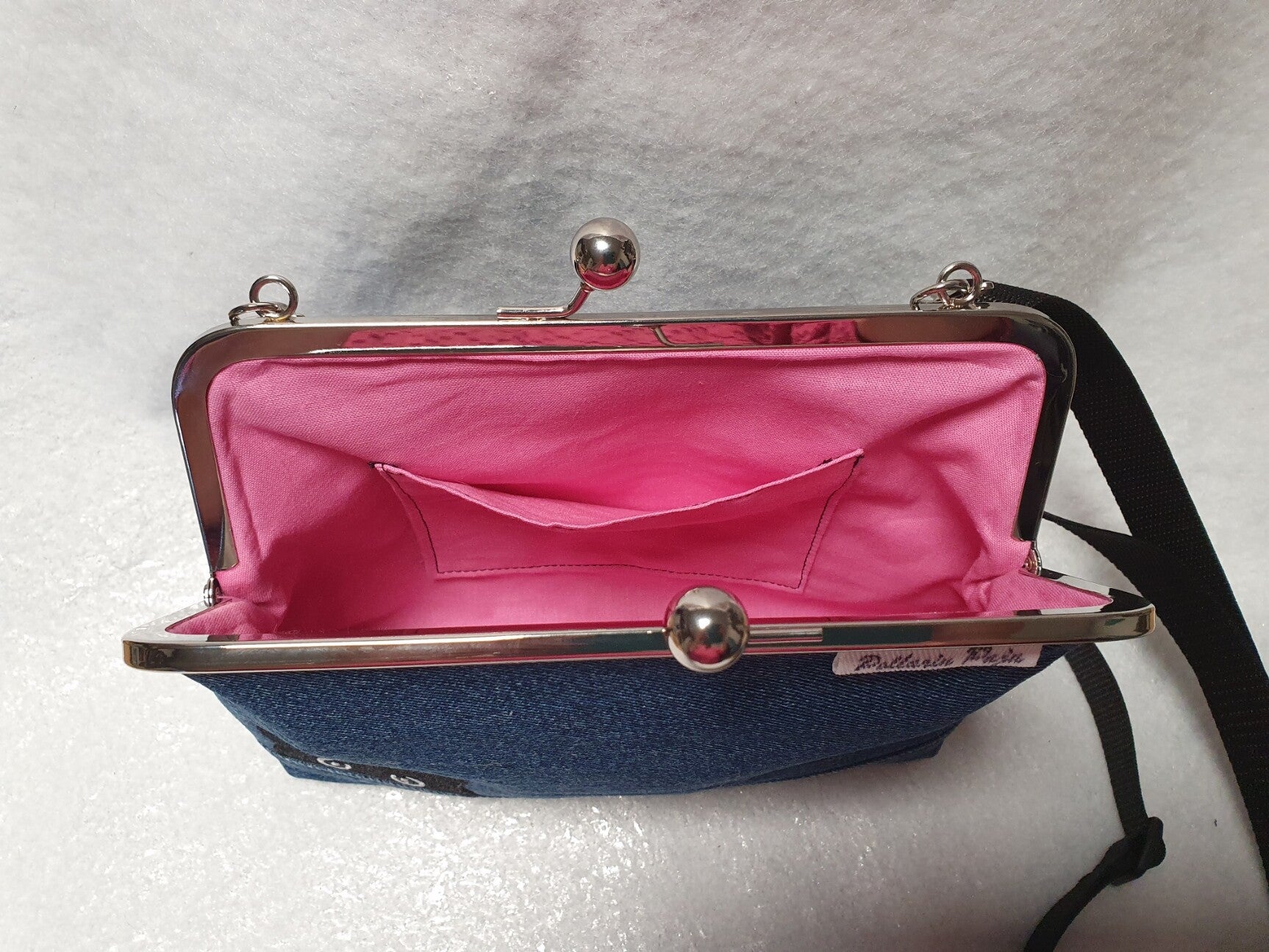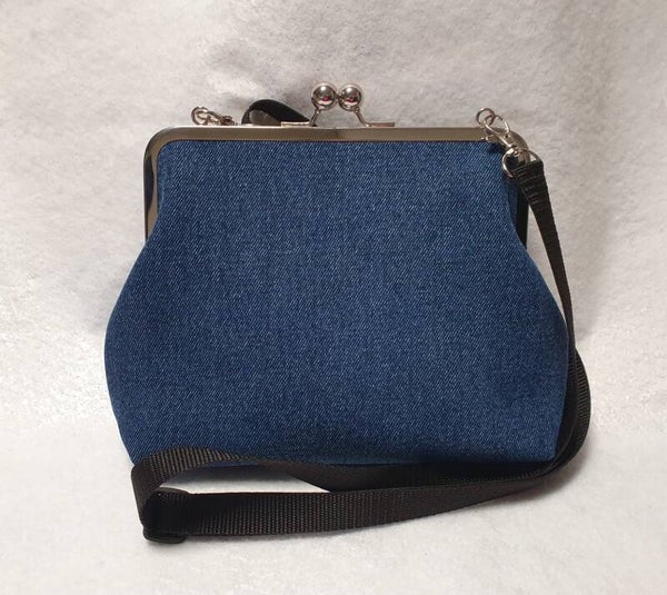 Kukkarolaukku 21cm lukolla ja säädettävällä hihnalla max 150cm. Laukun mitat korkeus 19cm leveys 26cm, pohja 5cm. Laukkuun mahtuu hyvin puhelin, lompakko, avaimet ja muut tarpeelliset pientavarat. Sisällä yksi avotasku. Laukun päälinen kierrätysfarkku, vuori puuvilla. Tukena liimahuopa.