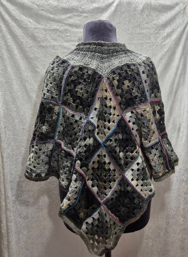 Persoonallinen ja uniikki poncho isoäidinneliöistä. Lanka on Hobbiin Tea Time 100% akryyli. Koko on monelle sopiva M - XL. Mitat Pituus edestä ja takaa 80cm, pituus sivusta 57cm, leveys 100cm. Pesu 30 asteessa ja tasokuivaus.