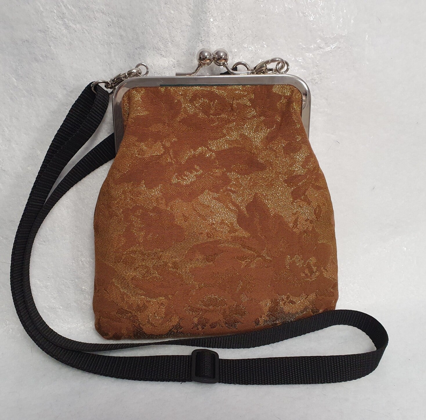 Kukkarolaukku 15cm lukolla. Laukku sekoitekangas ja sisällä puuvillavuori, tukena liimahuopa. Laukussa säädettävä hihna max. pituus n. 150cm.