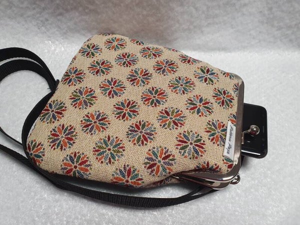 Kukkarolaukku 15cm lukolla ja säädettävällä hihnalla max 150cm. Laukun mitat korkeus 22cm leveys 21cm. Laukkuun mahtuu hyvin puhelin, lompakko, avaimet. Päälinen gobeliini ja vuori puuvilla. Tukena liimahuopa.