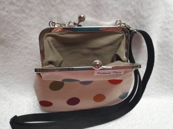 Kukkarolaukku 15cm lukolla ja säädettävällä hihnalla max 150cm. Laukun mitat korkeus 22cm leveys 21cm. Laukkuun mahtuu hyvin puhelin, lompakko, avaimet. Päälinen gobeliini ja vuori puuvilla. Tukena liimahuopa.