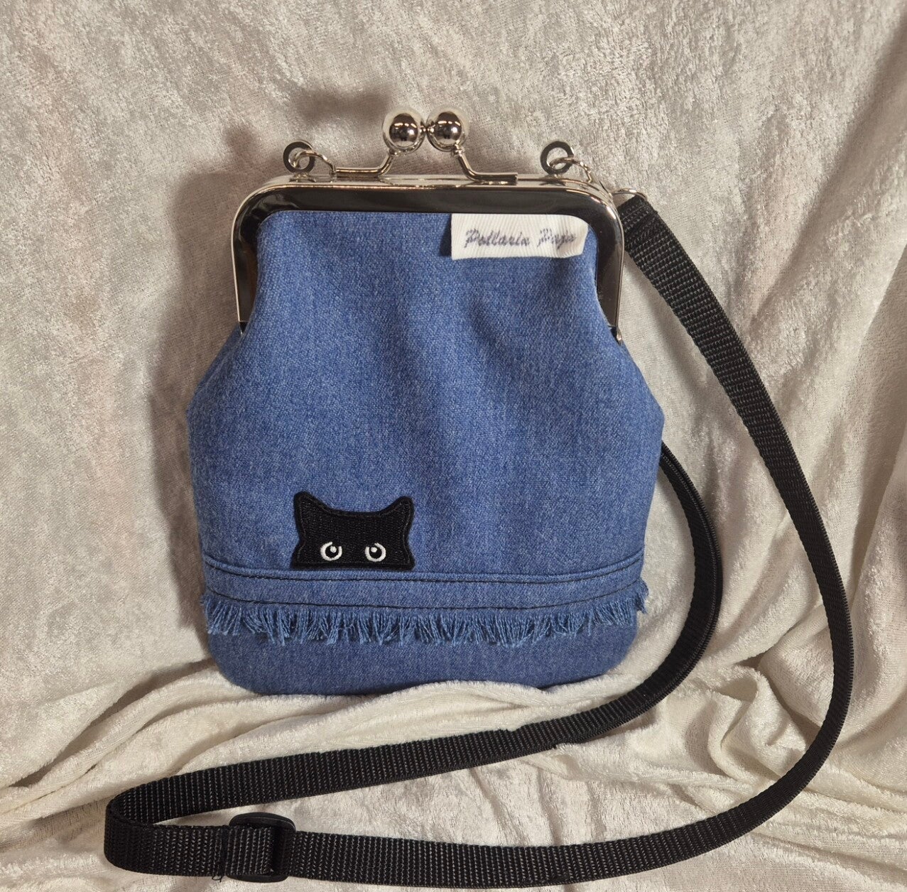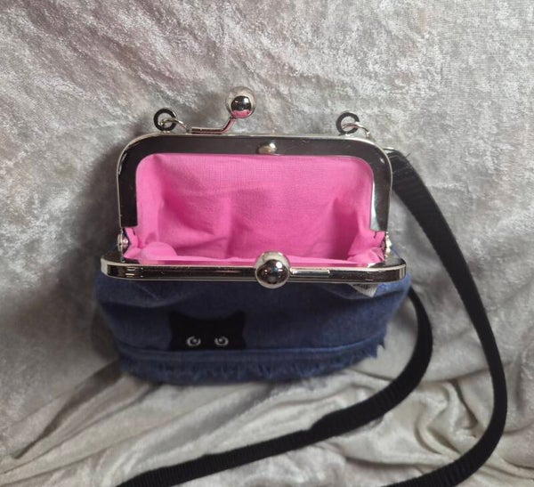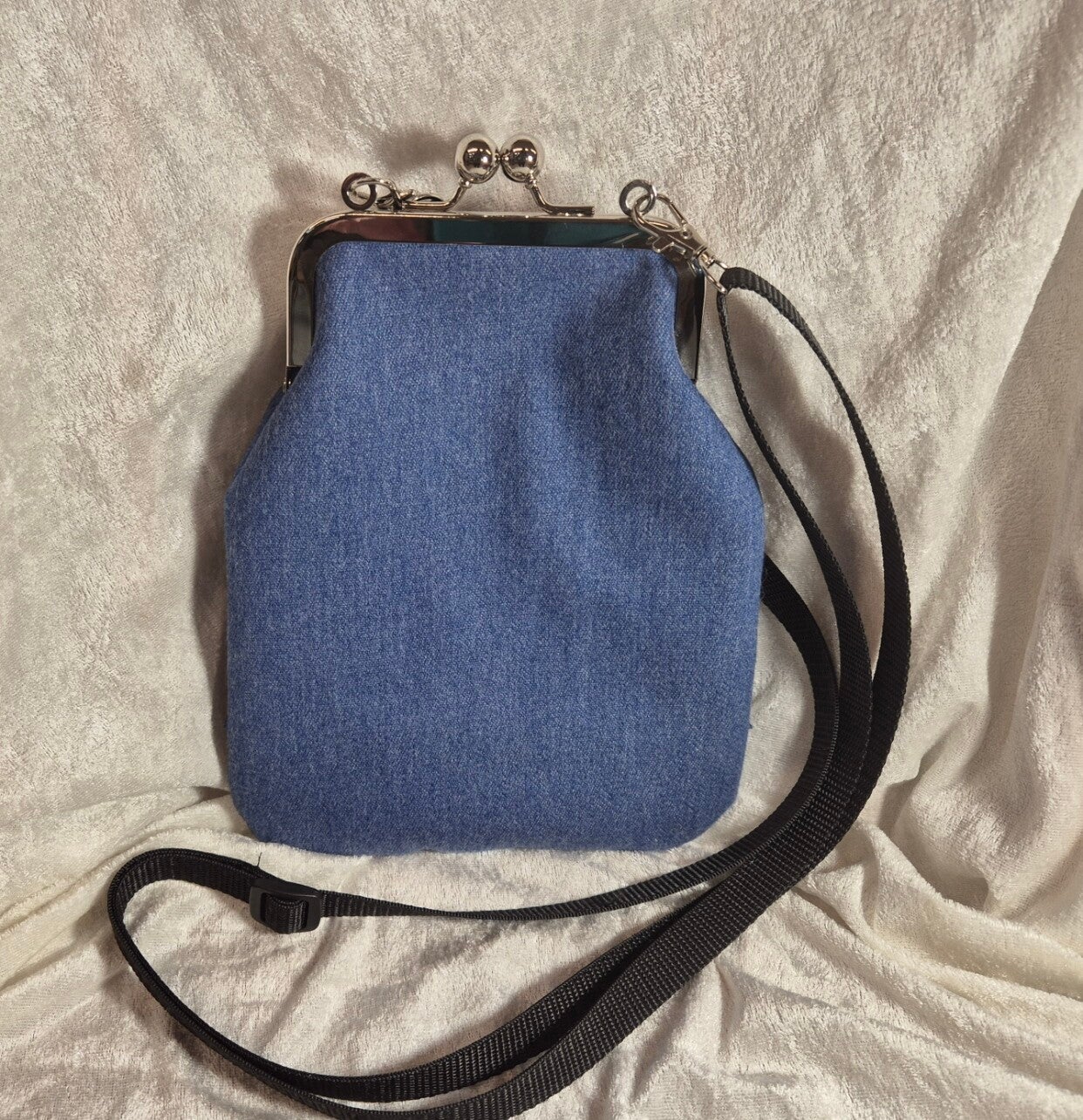 Kukkarolaukku 12cm lukolla ja säädettävällä hihnalla, max pituus 150cm. Laukun materiaali farkku, vuori puuvillaa ja tukea antamassa liimahuopa.